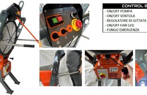 - Cannoni FISSI o BRANDEGGIANTI (orizzontale/verticale) gestiti tramite PLC (possibilità di Kit opzionale Industria 4.0 con diritto al credito d'imposta); controllabili tramite programmazione, radiocomando, sensore di movimento, magnetico, sonda (disponibilità optional lancia alta pressione con 10ml di tubazione, pompa dosatrice per prodotto abbattente i cattivi odori)