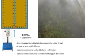 - Realizziamo e installiamo LINEE NEBULIZZANTI AD ALTA PRESSIONE su misura che, posizionate ad esempio lungo i confini di baie, o all'interno di capannoni, consentono di evitare la fuoriuscita di polveri e/o cattivi odori (diluizione in acqua di appositi prodotti abbattenti come DEODOR, DEODOR FIORITO e MALEO)